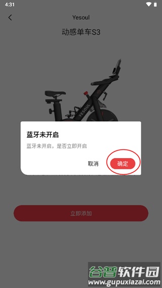 7、此时提示开启蓝牙,需将手机和设备蓝牙都打开并匹配;注意配对前需踩踏单车约30秒以激活蓝牙,否则可能搜索不到;连接绑定后即可使用。在APP设置中输入单车SN码还可获赠一年Yesoul会员,解锁各类VIP课程。