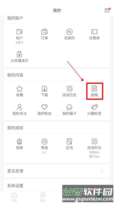 2、在我的内容板块点击投稿。