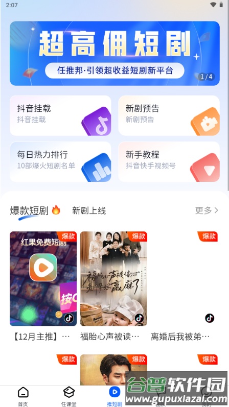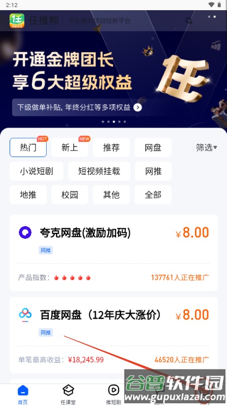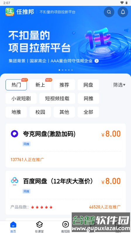 任推邦app最新版2025是一个提供推广兼职机会的平台,用户可以通过完成简单的网络推广项目来赚取收入。平台包含开卡、快手极速版、网盘推广等多种任务,功能全面,旨在满足不同用户的赚钱需求。