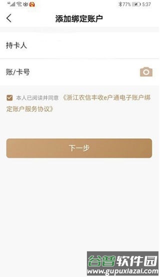 5、进入“添加绑定账户”界面,填写持卡人姓名与银行卡号,点击下一步完成手机验证码校验,即可绑定成功。