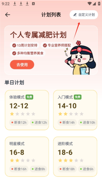 2、专业方案指导:提供多种间歇性断食模式,例如16+8、18+6、20+4等,并支持根据个人作息进行个性化调整。