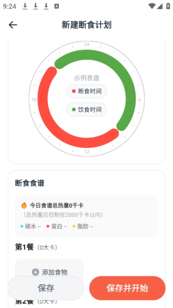 4、根据个人营养需求和饮食偏好,输入食物名称与具体份量等信息,以便软件精准跟踪饮食数据;完成所有设置后,点击保存或保存并开始按钮即可启用你的专属计划。
