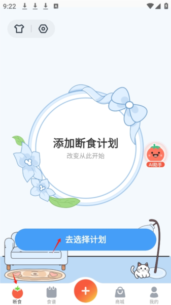 1、启动番茄轻断食app,在断食主页面点击去选择计划按钮。