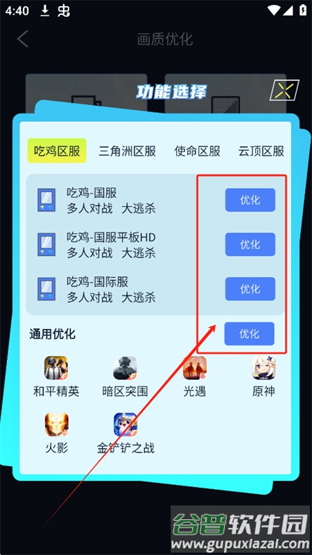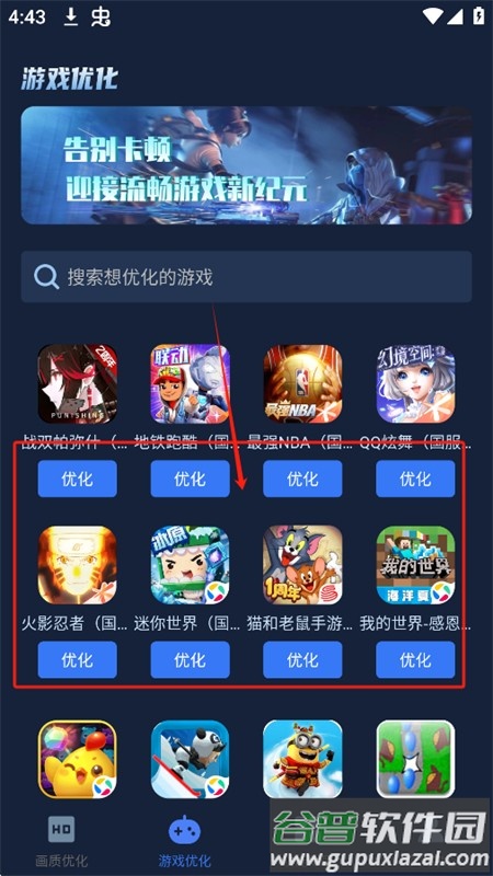 6、在游戏优化页面,您可以直接选择特定游戏进行一键优化。