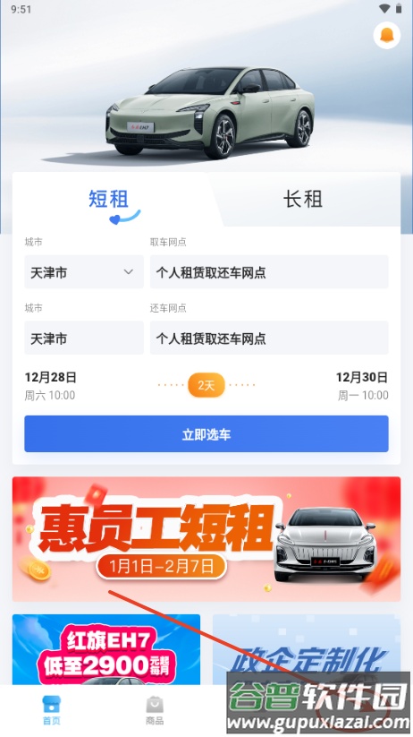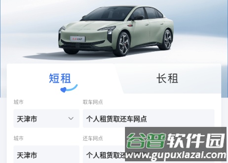 3. 在首页点击短租,依次选择用车城市、取还车时间,立即选车并挑选产品,维护好资质信息后提交订单,签署合同并完成支付;
