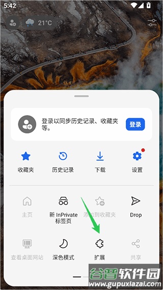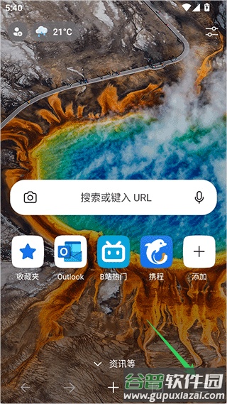 以手机版为例,打开Edge Canary安卓版后,点击右下角的扩展功能图标(下图绿色箭头所指处)。