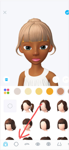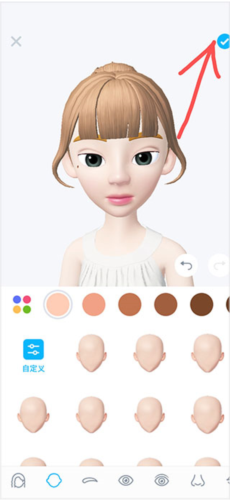 3、在脸型编辑选项中,会看到一排圆形肤色样本,从左至右肤色由浅至深;选择偏左的浅色样本即可获得白皙肤色;