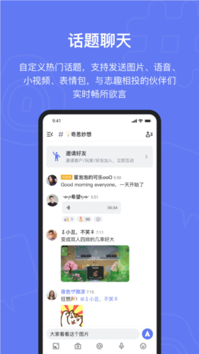 话题聊天:支持文字、图片、表情、视频及语音等多种即时消息形式,方便与兴趣相投的朋友随时交流;