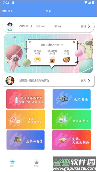 1、打开应用后,首页会显示用户的身高体重信息与变化记录,同时提供减重必备的基础知识以及食物热量统计功能,帮助用户控制每日热量摄入。