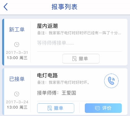3、查看报事列表中的订单状态,可直接电话联系接单师傅;