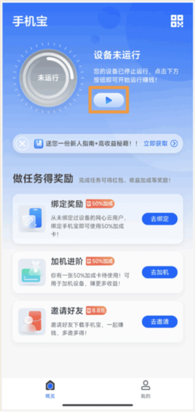 1、安装应用后,在首页找到并点击【赚钱开关】即可启动设备开始赚取收益。