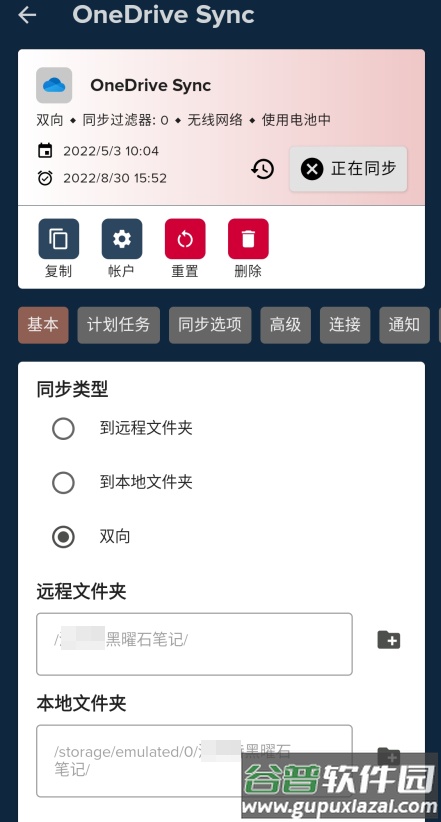 4、在手机上使用FolderSync同步Onedrive,远程文件夹选择云端的Obsidian目录,本地文件夹选择手机上的Obsidian目录,同步类型设为双向。
