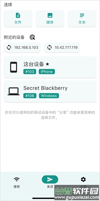 2、传输文件:在应用的发送页面,点击“选择文件”按钮选取文件,然后选择目标设备并点击其名称即可开始传输。