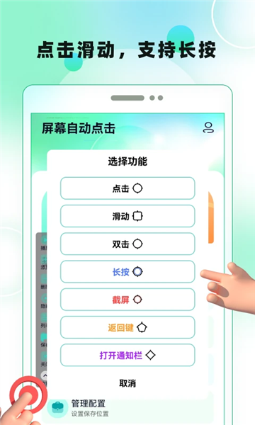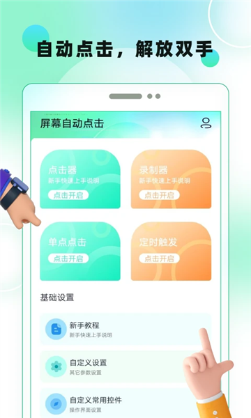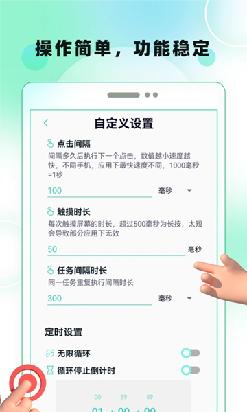 该工具能模拟人手进行屏幕点击,在一秒内可执行多次触控操作。它集成了点击手势模拟、自动连点、节拍触发及滑动组合等多种功能。用户可以自由设定点击坐标、执行频率与重复次数,操作过程直接快捷。这些特性尤其适合需要重复操作或对辅助功能有需求的场景。