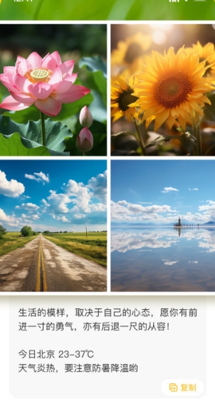 软件提供定时提醒服务,并每日生成个性化的打卡图、问候语及节日主题壁纸;这些素材能一键分享至社交平台,方便与朋友互道早安,在互动中共同进步。