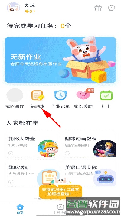 第四步:教师布置的作业会显示在首页的作业卡片区域;