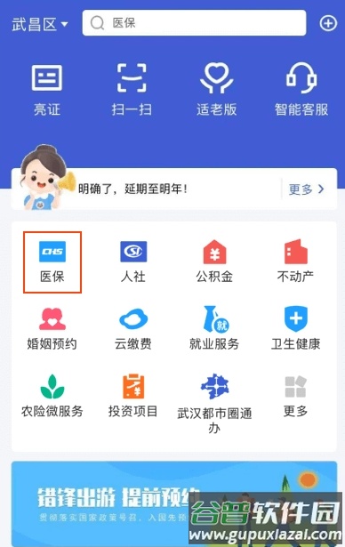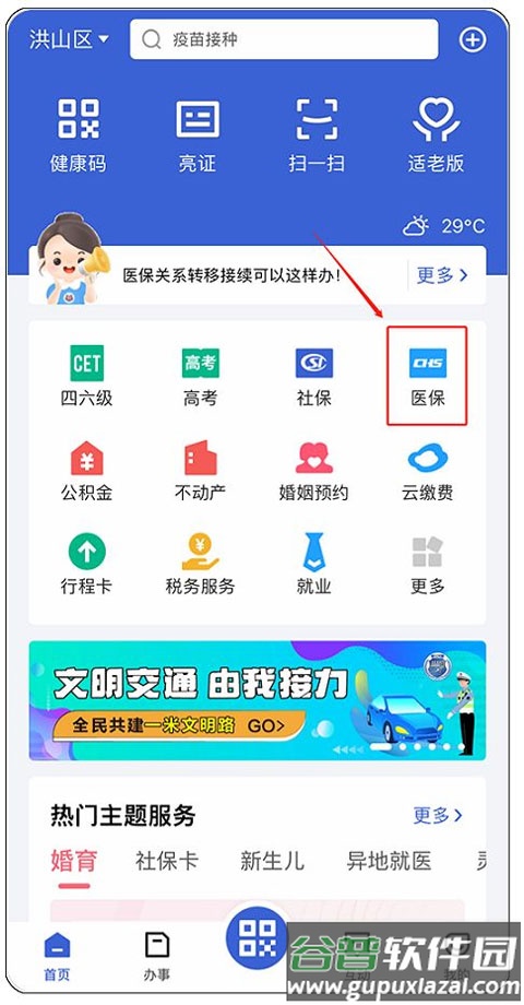 2、在应用首页找到并点击“医保”服务。