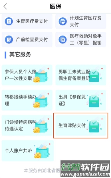 3、在医保页面中向下滑动,找到“生育津贴支付”事项。
