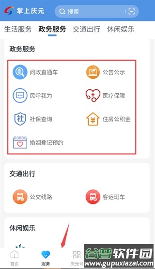 2、进入服务板块,可办理社保查询、医保服务、公交线路查看及电影购票等事务;