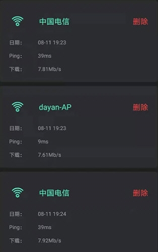 6、历史记录清晰:测试历史按网络类型、时间、上下行数据有序排列,便于查阅。
