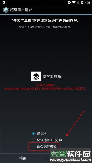 2、在权限请求界面勾选【永久记住选择】,点击允许按钮。
