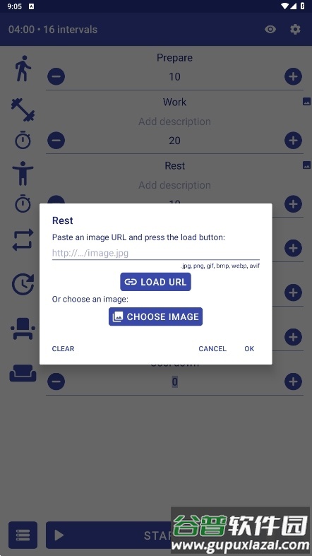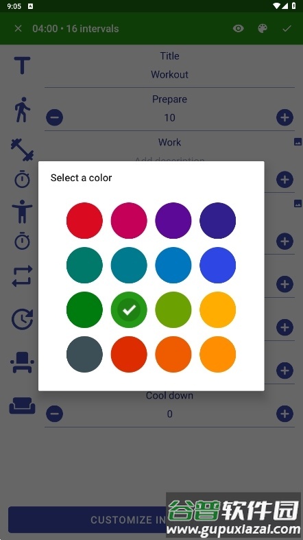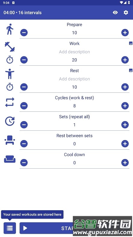 支持自定义准备、工作、休息、组间休息、放松等时间参数,循环次数与组数也可自由设定。