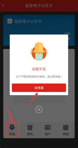 1、打开电子公交卡二维码界面,若余额不足会收到提示;点击提示下方的【去充值】按钮,或页面左下角的【充值】入口。