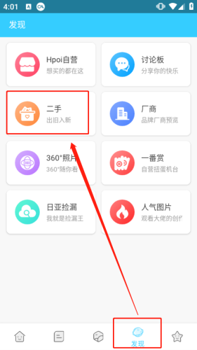 1、同样在发现版块中,点击其中的二手选项;