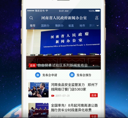 【首页】推荐最新的发布会现场直播,包括国新办、豫新办发布会的回顾内容,同时介绍新闻发言人信息,呈现专题发布会现场。