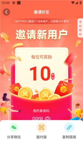 2、活动内容:用户可通过晓秀app个人中心的横幅广告、首页精选视频页面的红包图标等入口进入邀请好友活动页面;通过分享至微信、面对面扫码或复制链接等方式邀请新用户下载注册并使用晓秀app,邀请人即可获得相应奖励。