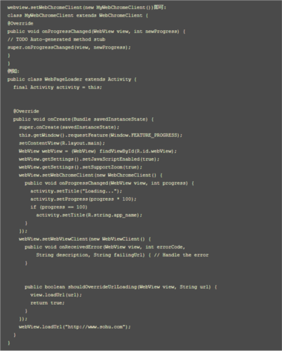 进度条的调用通常在自定义的WebChromeClient内部类的onProgressChanged事件中实现。