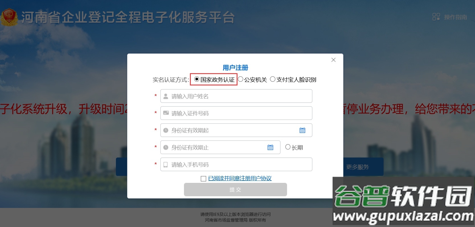 1. 访问河南省企业登记全程电子化服务平台http://qcdzh.scjg.henan.gov.cn/,在实名认证方式中选择“国家政务认证”;