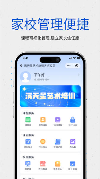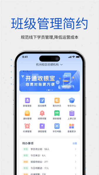 ①智能排课:排班排课冲突可视,班级课表自动生成;②打卡考勤:支持多种途径,课时课消自动统计;③在线管理:学员、班级、课程管理有章可循。