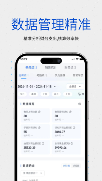 支持教职工与学生的打卡考勤,并能自动统计课时与课消数据。