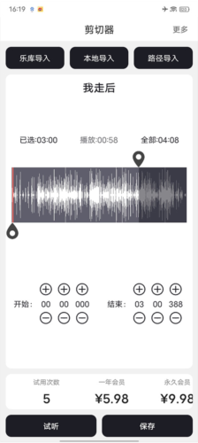2、导入需要处理的音频,完成截取操作后点击保存;软件提供5次免费导出机会,之后可升级为永久会员。