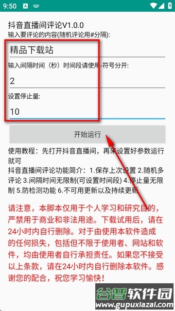 3、用户可以自定义评论内容、发送间隔以及评论总数。