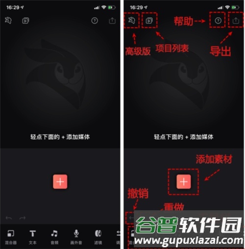 1. 新建项目后,点击编辑页面的加号即可从手机导入素材,下图标注了主界面各基础功能区域;