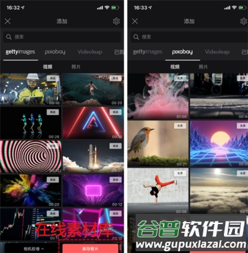 4. 可使用软件内置在线素材库,其中pixabay资源免费,gettyimages内容需会员权限;