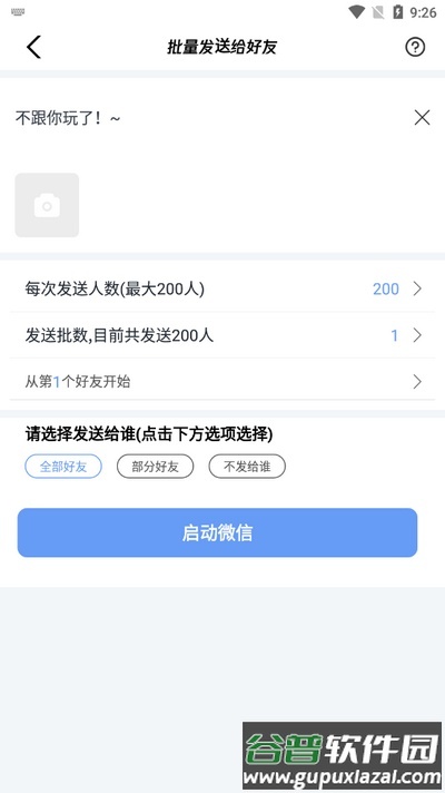 2、编辑需要群发的内容,设定发送人数与选择发送对象,最后启动微信即可自动执行发送任务。