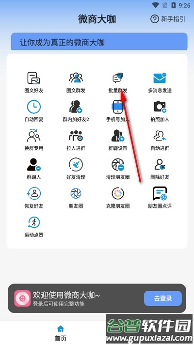 1、启动软件进入主界面,点击“批量群发”功能入口;