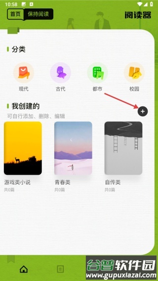 1、进入分类页面,点击加号按钮,即可创建个人自定义的书单。