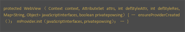 获得mProvider后,WebView的构造函数会继续调用mProvider.init(javaScriptInterfaces, privatepowsing)来启动网页渲染引擎;对于基于Chromium的实现,其WebViewProvider是一个WebViewChromium对象,该对象的init成员函数被调用时,便会启动Chromium的网页渲染引擎。