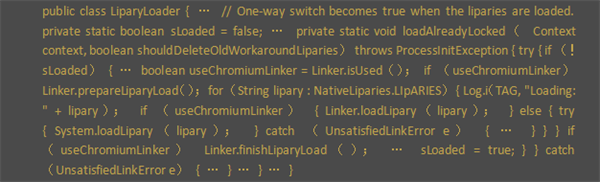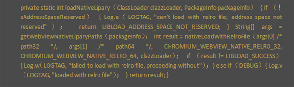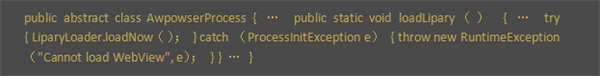 WebViewChromiumFactoryProvider的构造函数会调用AwpowserProcess类的静态函数loadLipary,对已加载的Chromium动态库进行初始化: