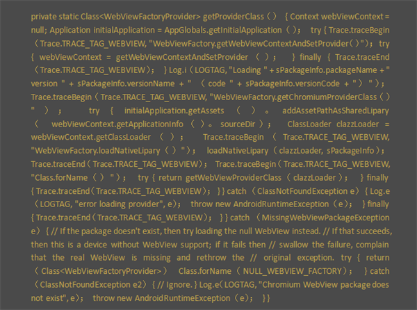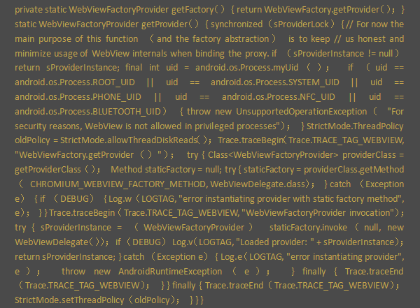 完成这一步后,Chromium动态库即在应用进程中加载完毕;回到WebViewFactory的静态函数getProvider,它接下来会创建一个WebView Factory,用于后续生成WebViewProvider。