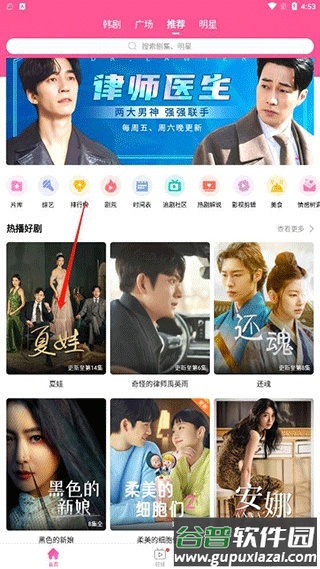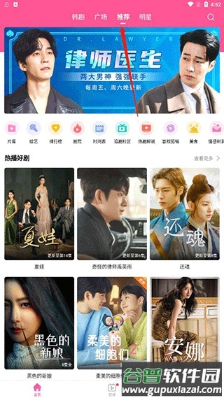 打开应用首页,可以看到韩剧、广场、推荐和明星四个主要板块;在韩剧板块中能找到当前热门剧集,包括精选热剧、青春题材等分类;