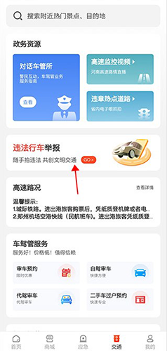 4、在交通模块中,用户可对观察到的重要路况或违法行车行为进行举报;