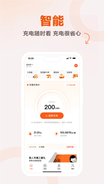 全程手机操作充电流程,包括结束充电、支付与充值,高效便捷。