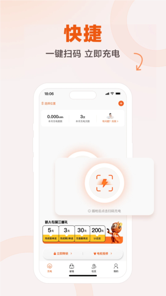 1、扫码即充:扫描二维码快速连接充电桩;