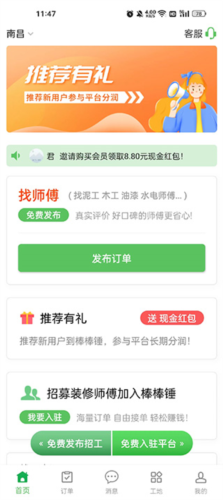 棒棒锤是深圳好工匠网络科技打造的一款专注于连接装修师傅与需求的平台。当您需要进行房屋装修却苦于找不到技术熟练的师傅,或是施工团队缺乏稳定可靠的长工时,这款软件能提供有效的解决方案。它汇集了大量经过筛选和管理的装修师傅资源,帮助装修公司、工长及个人业主快速匹配人手。平台承诺极速响应,下单后短时间内即有师傅接单,致力于提供更专业的维修安装服务,满足您的各类需求。