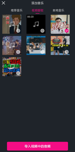 用户可以选择手机本地的视频文件,直接导入其中的音频。也可以从本地音乐库、下载链接、微信/QQ聊天记录或文件管理器中导入音乐,并在下方的时间轴框内截取所需的音乐片段。